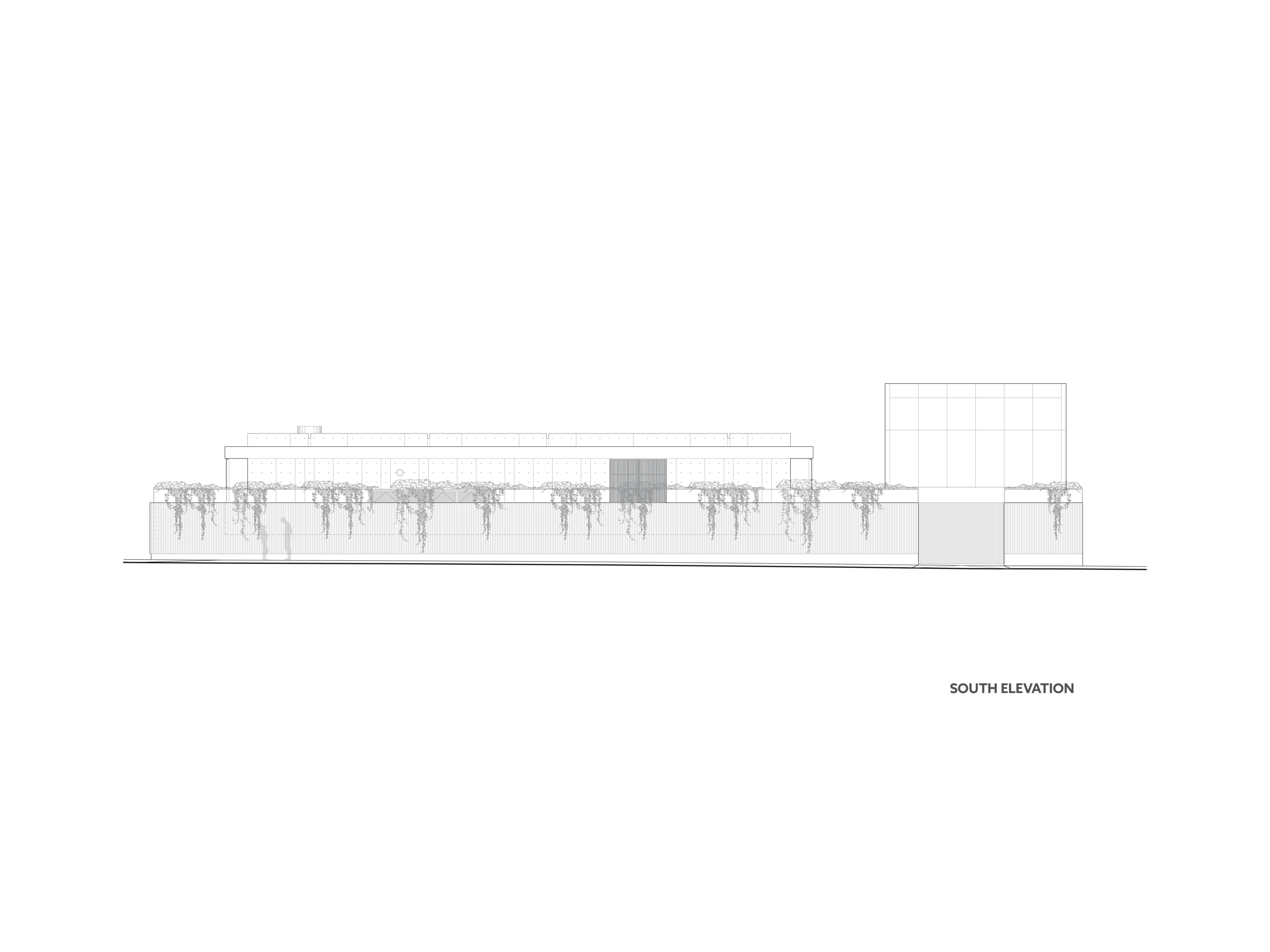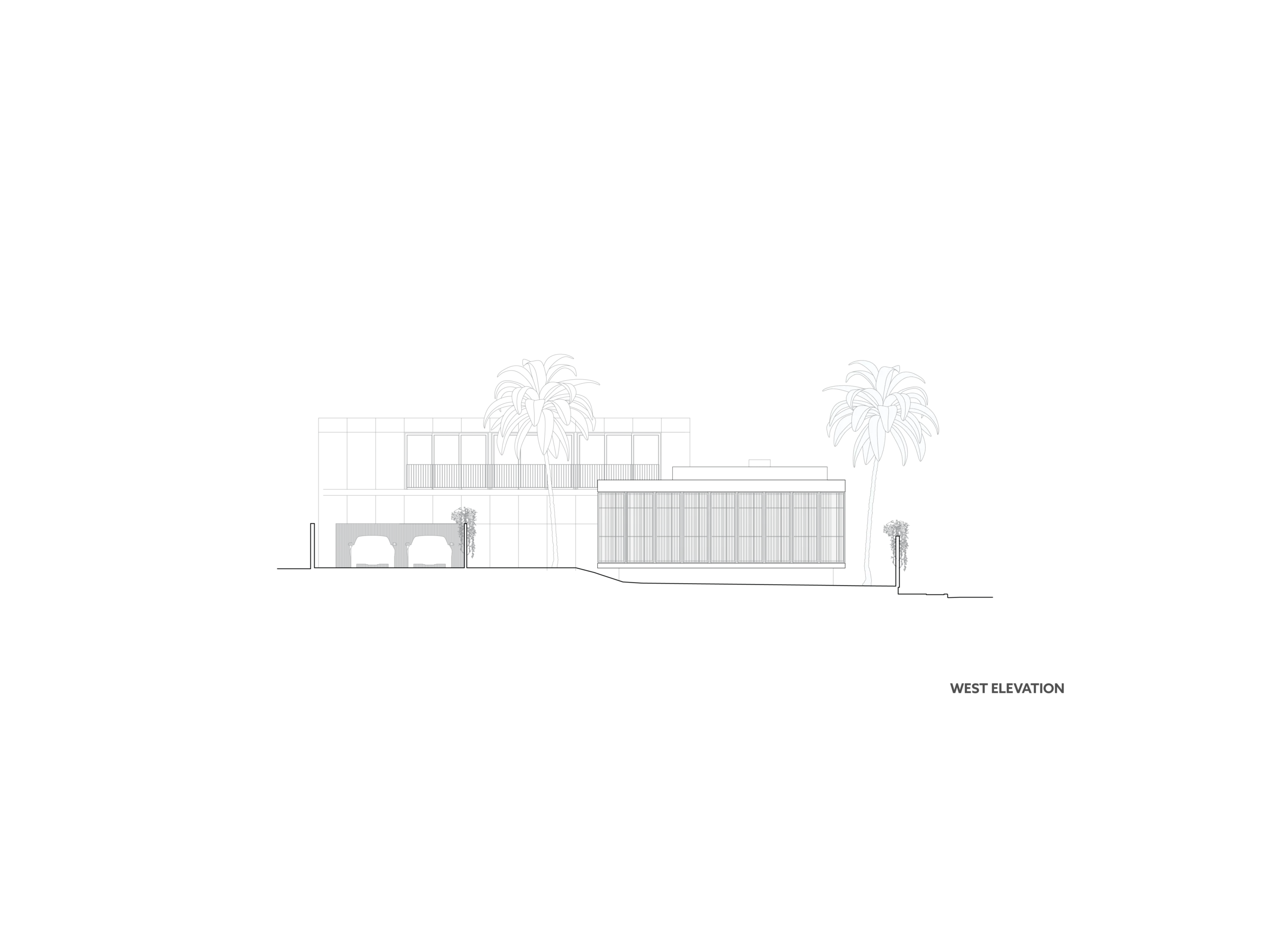 Adjacent to the pavilion, the garage/guest structure replaces an old service building. It will house a garage for up to eight vehicles with the use of car lifts for the client’s collection of automobiles. The second level includes three guest bedrooms, each with an ensuite bath. Conceived as a background building, this structure will act as a visual and physical buffer, enhancing privacy from a condominium next door. The site’s boundary is defined by a two-meter-high concrete wall topped with a metal frame and colorful bougainvillea, ensuring security and privacy.