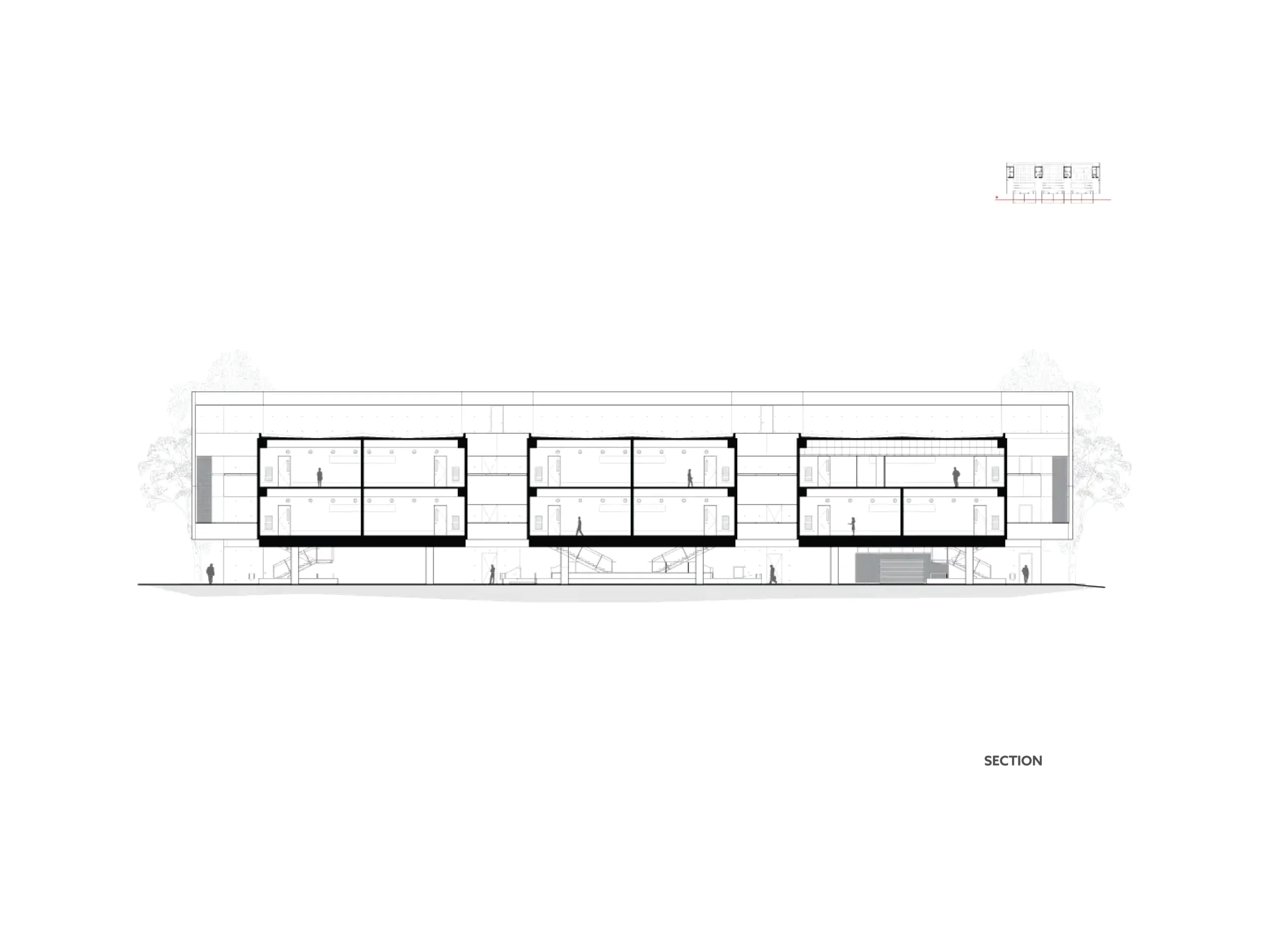 La planta baja es un espacio abierto y flexible para reuniones, clases informales y presentaciones, adaptándose a las diversas necesidades de la facultad. Los salones de clases en los niveles dos y tres están orientados hacia el cuadrángulo arbolado al oeste, mientras que las oficinas del profesorado se encuentran en la fachada este, protegidas por el quiebrasol. El cuarto nivel alberga los sistemas mecánicos del edificio.